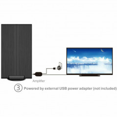 Κεραία τηλεόρασης με ενισχυτή 28 dB, για εσωτερικό χώρο ή εξωτερικό, που μπορείτε να τοποθετήσετε εύκολα στον τοίχο ή το παράθυρο και να βελτιώσετε τη λήψη της τηλεόρασής σας. Λαμβάνει σήματα UHF / VHF / FM. Τροφοδοτείται με ρεύμα από USB ώστε να μπορείτε να την συνδέσετε απευθείας με τον αποκωδικοποιητή σας, την τηλεόρασή σας ή απλό φορτιστή USB.